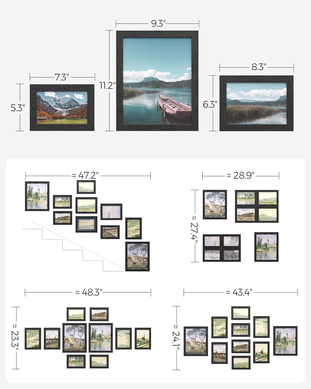 Display your cherished memories in style with the SONGMICS Collage Picture Frames Set. This set includes 10 frames in various sizes, including two 8×10 frames, four 5×7 frames, and four 4×6 frames. Perfect for creating a wall gallery or table display, these frames feature a sleek ink black finish that complements any decor.