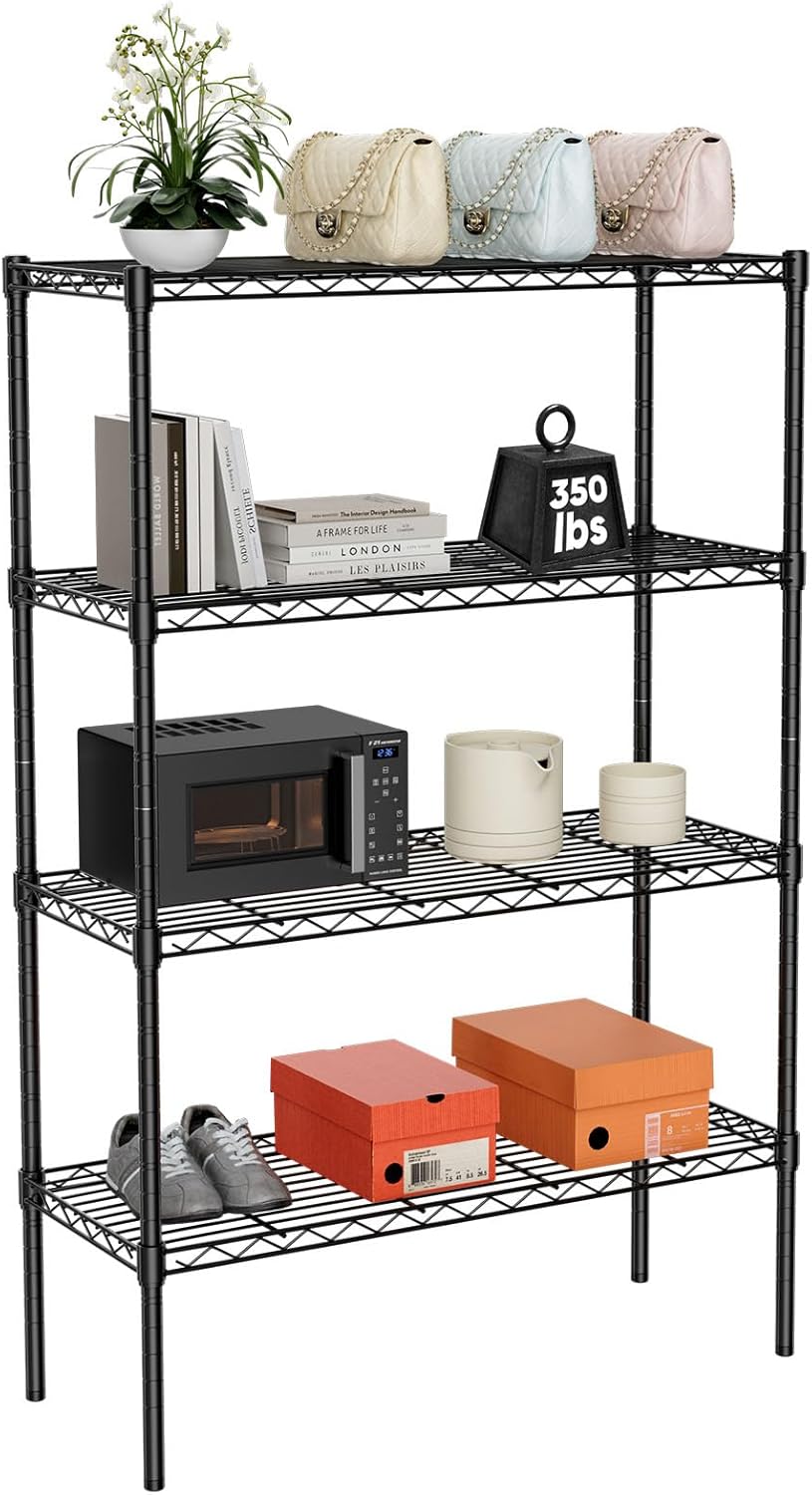 The Sweetcrispy 4-Tier Storage Shelving Unit is the perfect solution for organizing your home or office space. Made of durable metal wire racks, this heavy-duty standing shelf organizer can be adjusted to fit your specific storage needs. Measuring 13.8″ in depth, 35.4″ in width, and 54″ in height, this versatile shelving unit is ideal for use in the kitchen, closet, pantry, garage, bathroom, or laundry room.